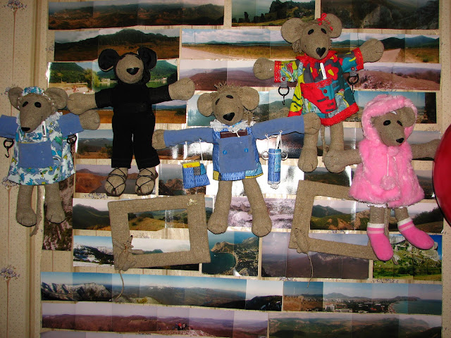 Каждая из них ростом 40 см., выполнены из грубой мешковины, наполнены синтепоном. В ручки вставлен каркас, благодаря чему игрушки могут висеть, сохраняя свои распростертые объятия. Родились они накануне 2008 -го года и были призваны решить проблему новогодних подарков. Надо отметить, что я не очень приветствую нефункциональные подарки, поэтому у каждой мышки было свое предназначение.